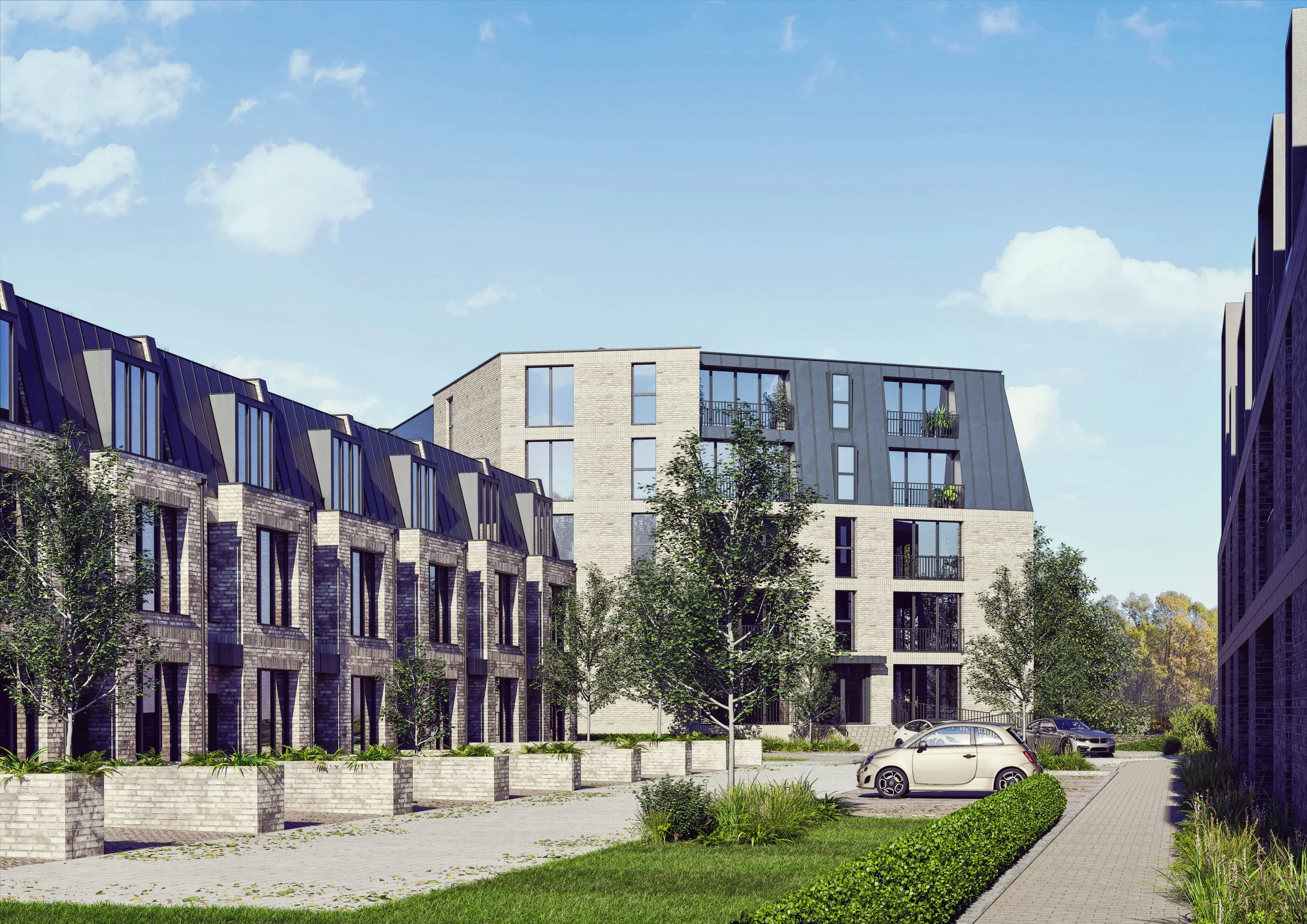 The architectural approach draws on the character of the original Ladywell House, reinterpreting its massing and distinctive mansard roof form to create a sense of continuity and place. Contemporary articulations, including balconies and private roof terraces, introduce a modern residential identity. The townhouses adopt the same material palette and design language, ensuring a cohesive development across the site.